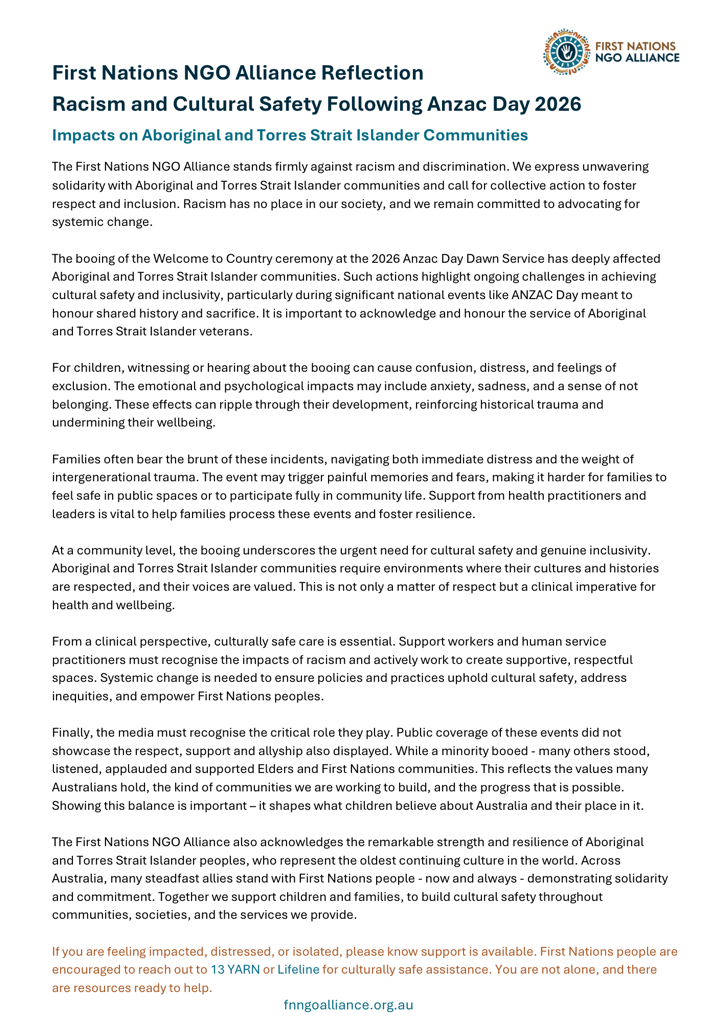 The First Nations NGO Alliance Reflection on Anzac Day 2026